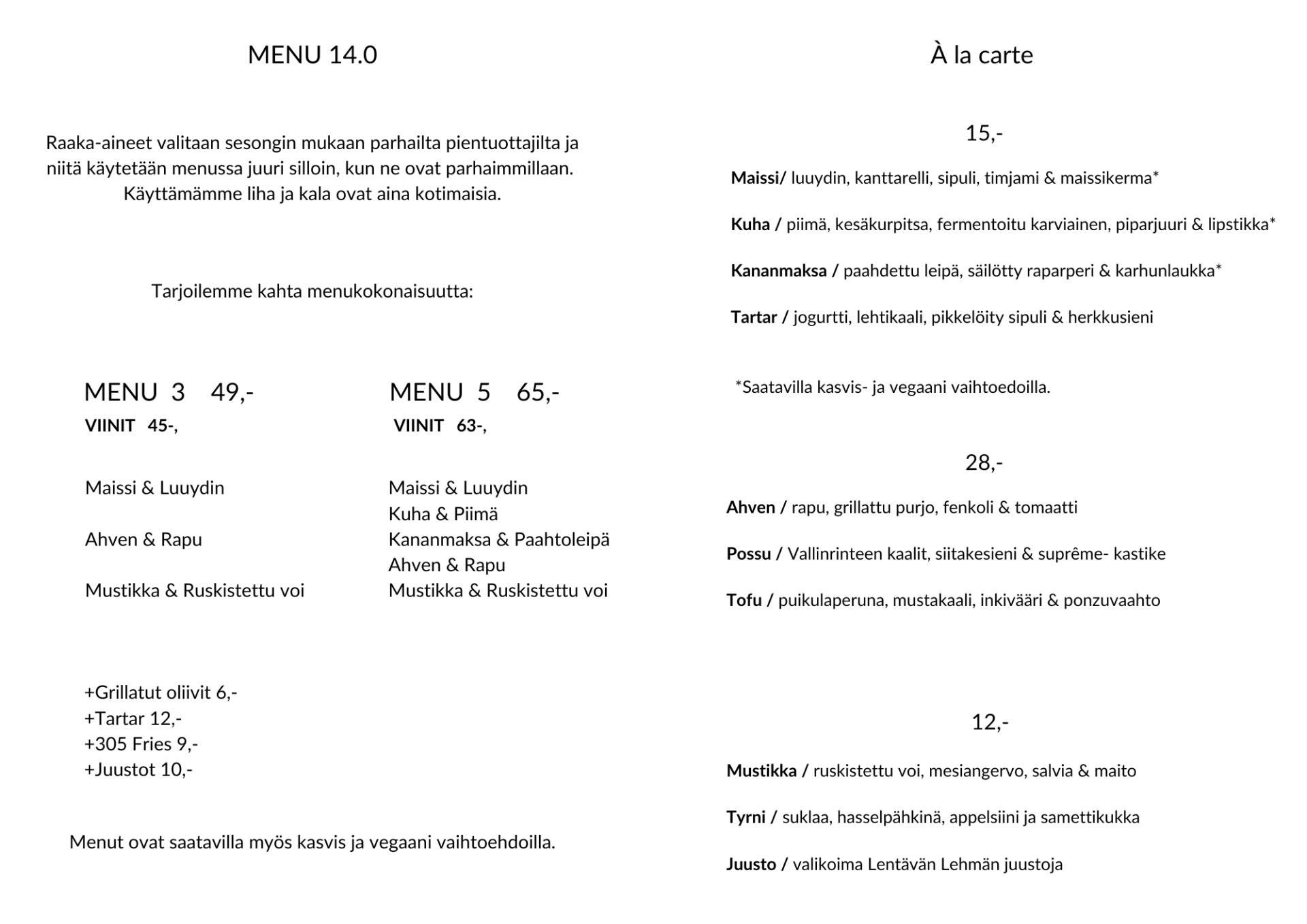 Kausittain vaihtuvasta ruokalistasta löytyy yksittäisten annosten lisäksi kahta menukokonaisuutta.