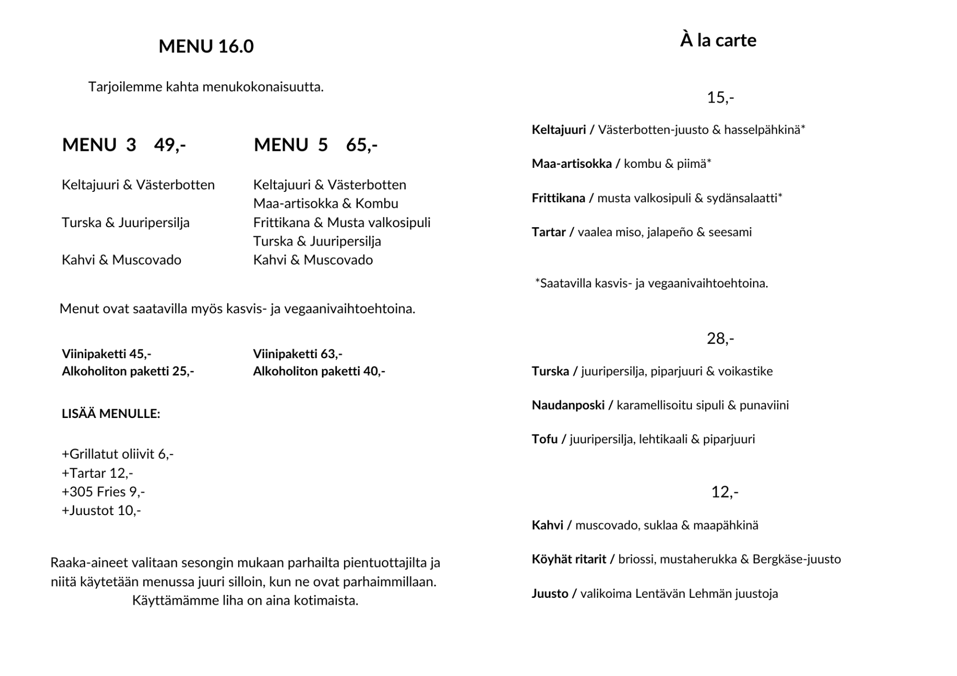 Raaka-aineet valitaan sesongin mukaan parhailta pientuottajilta. Käytämme niitä menussa juuri silloin, kun ne ovat parhaimmillaan. Meillä tarjoillaan vain kotimaista kalaa ja lihaa. Menu 305 on saatavilla myös kasvis- tai vegaanimenuna.