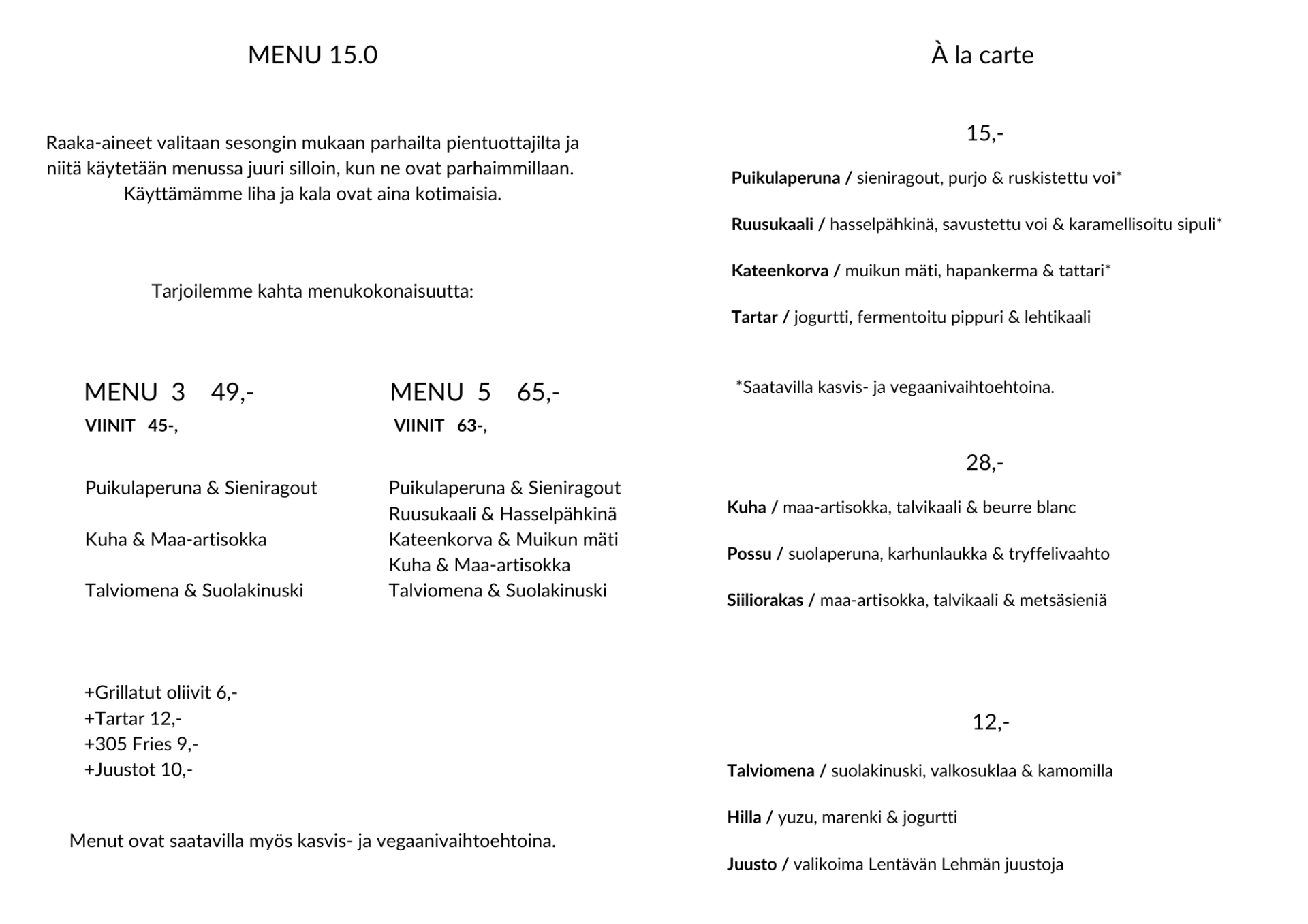 Kausittain vaihtuvasta ruokalistasta löytyy yksittäisten annosten lisäksi kahta menukokonaisuutta.